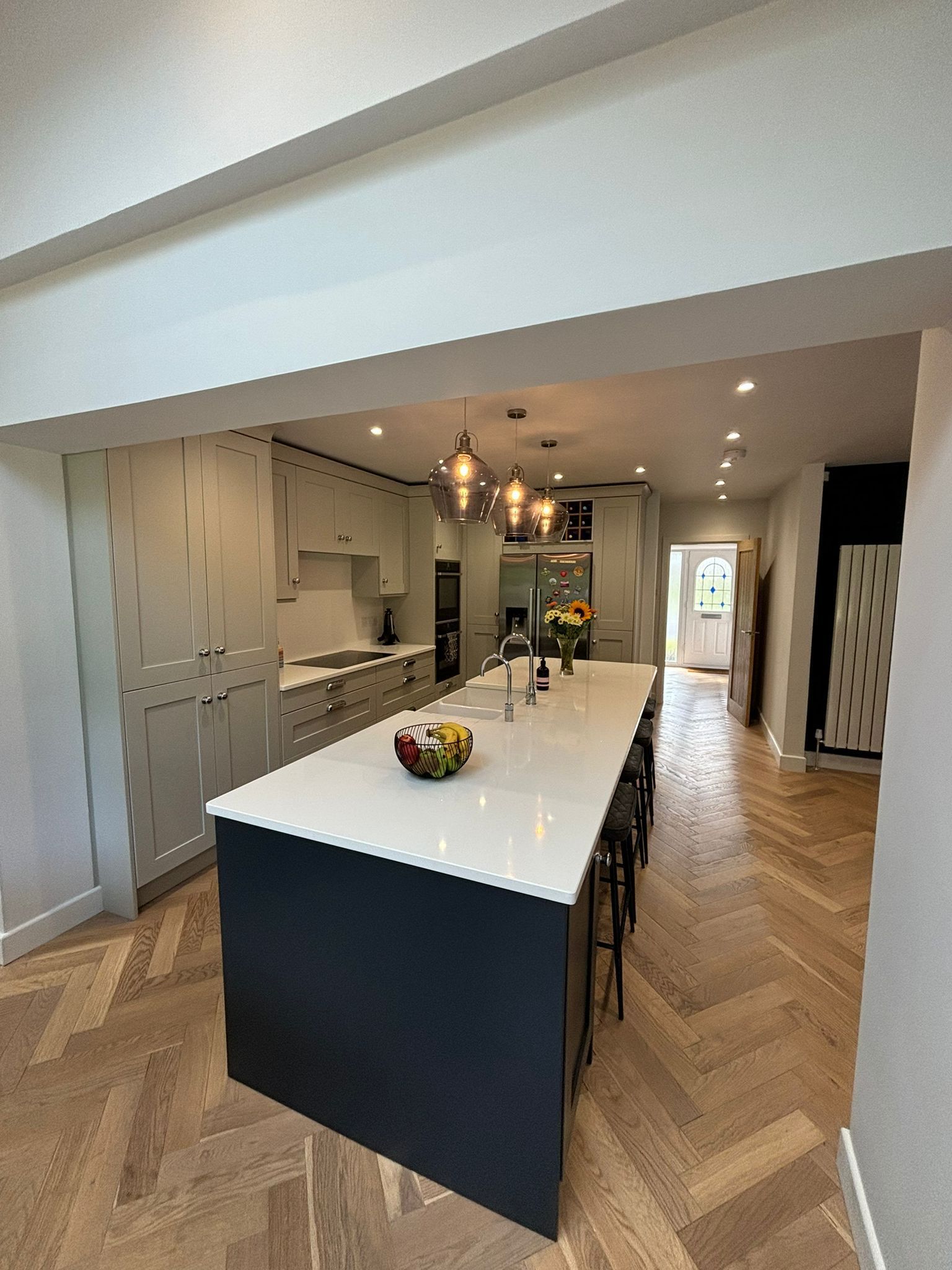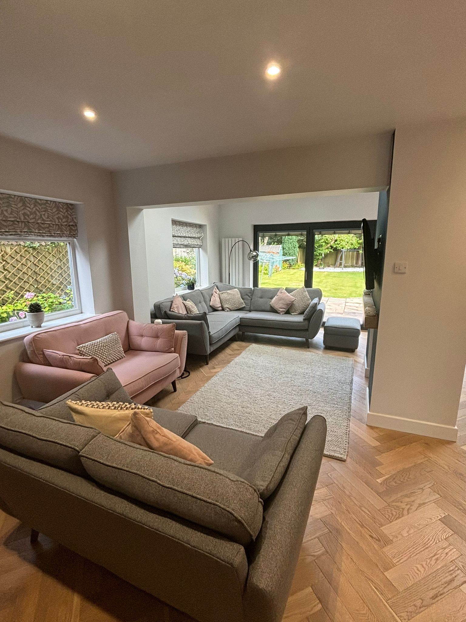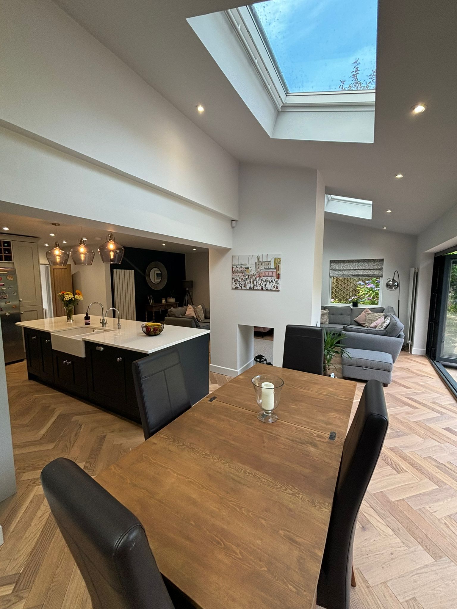 This project was a complete first floor remodel of a dated single family property. Our clients wanted to expand the kitchen space to include open plan dining with sliding bi fold doors leading out to the rear yard bringing the outside in when weather allowed. In addition the lounge space was fully renovated bringing a fresh and modern new look to the home.