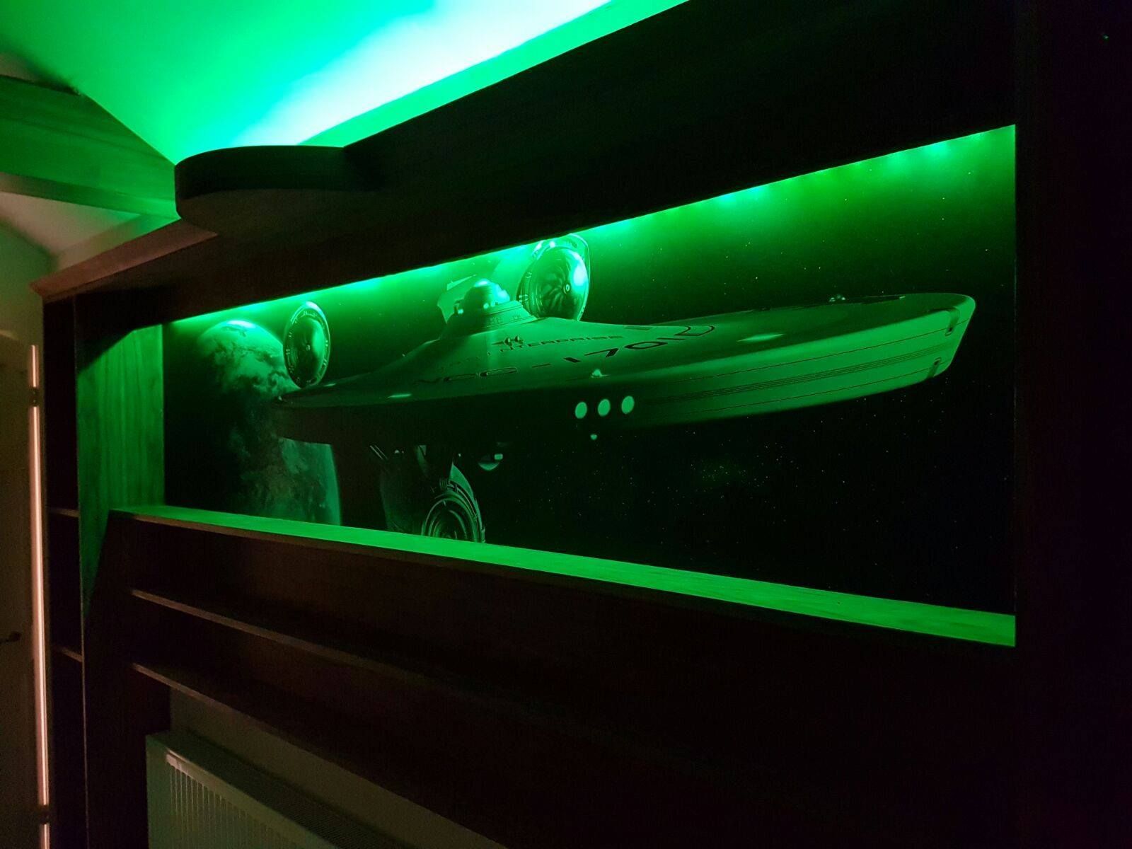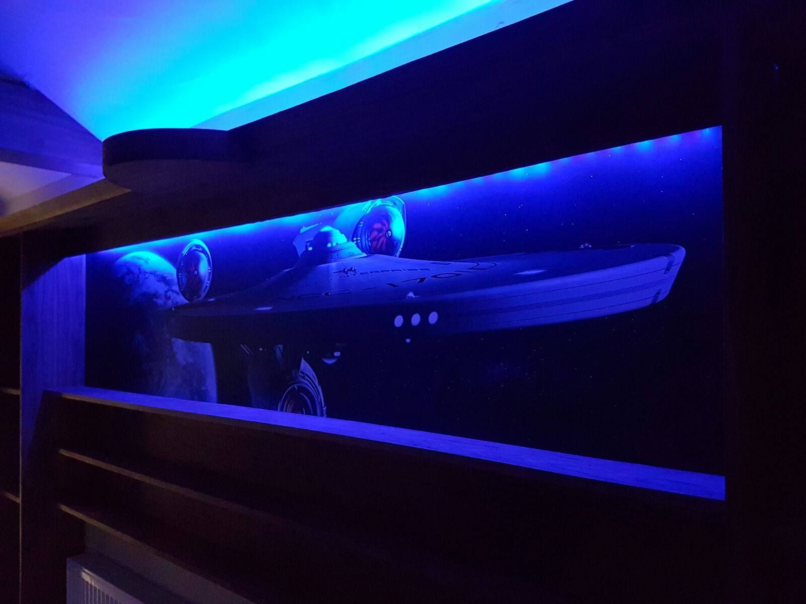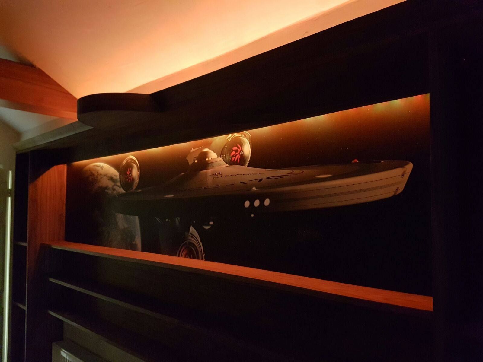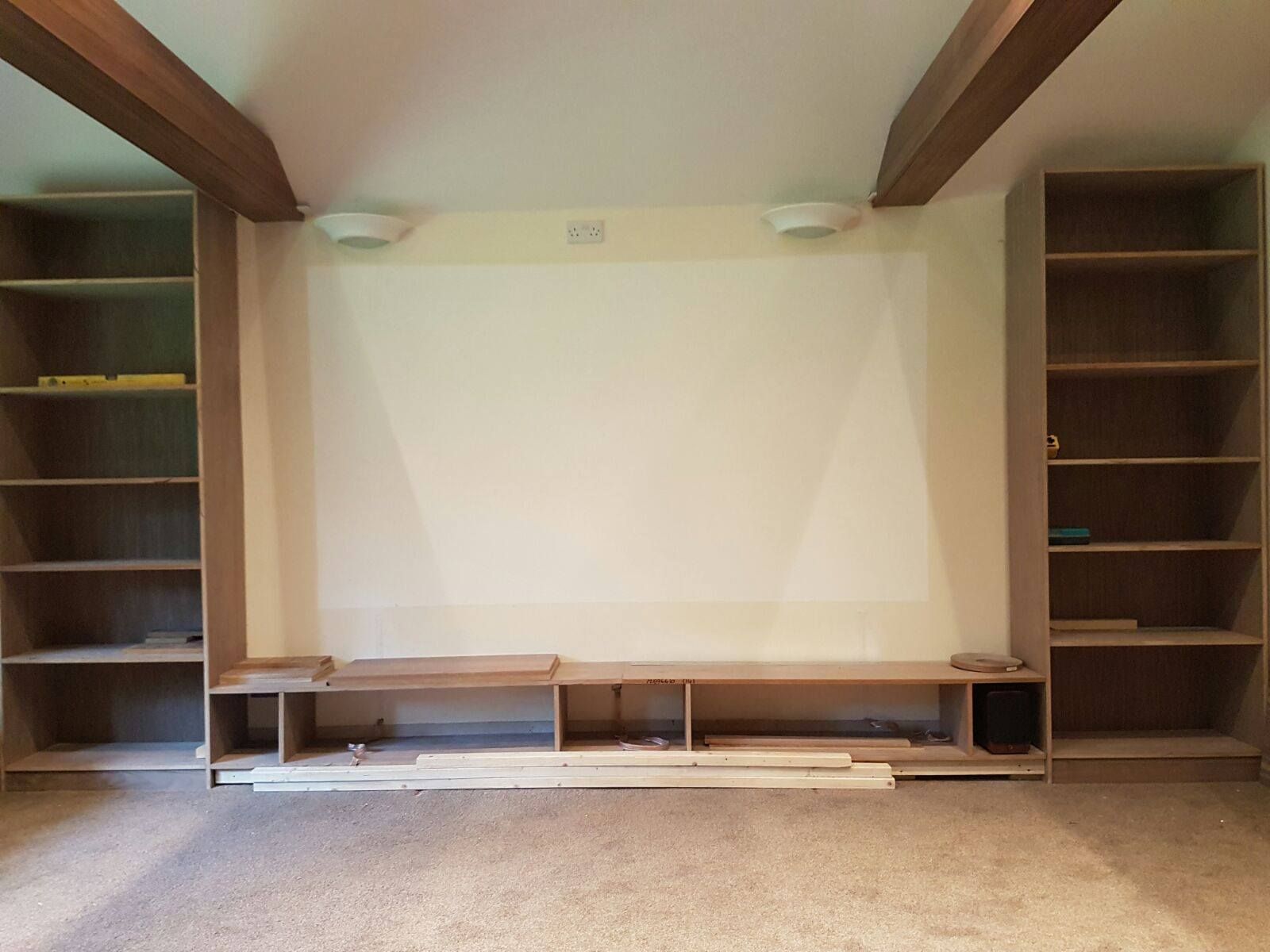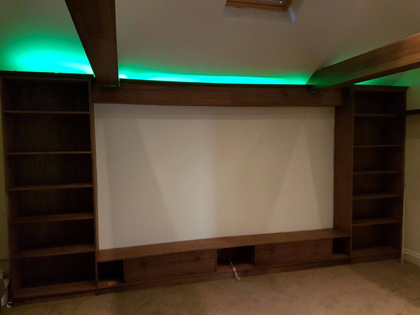 The custom shelving and AV equipment racking are incredibly functional and aesthetically pleasing, and the large graphic panels truly add a unique touch. The adjustable LED lighting is an excellent additional feature. We are thrilled with the results and would highly recommend them to anyone looking for a top-quality home theatre installation.