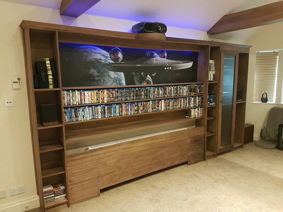 This project was the transformation of a secondary lounge space into a bespoke cinema room. With custom walnut cabinetry and shelving, a bespoke movie mural finished off with LED custom lighting and overhead projection system for a full home movie theatre experience.